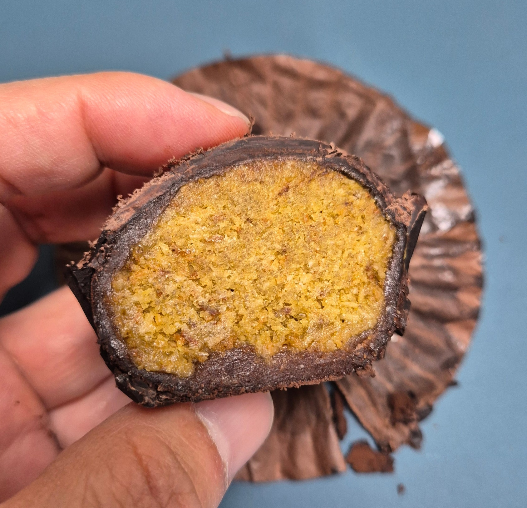 이중 포장된 플라스틱 케이스까지 제거하면, 드디어 매끈한 '정수리' 모양의 초코 겉면이 짜잔!